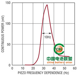 圖1 小型壓電換能器所提供的功率隨壓電頻率變化。