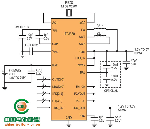 電池輸入為升降壓轉換器供電,當沒有采集能量可用時,該轉換器會工作于1.8~5.5伏特的輸入電壓范圍,以便在輸入電流高于、低于或等于輸出電流時,都能立即調節,同時裝置將自動轉換到