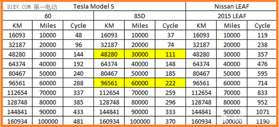 Tesla對于電池的設計理念來說,是要做更大的電池來規避掉很多的問題。我們可以理性的從用戶期望里程對單次里程的比例,來分析電池的容量衰減情況。如圖3所示,相對LEAF,270英里的續航里程對84英里的續航里程優勢太大,同樣達到10萬公里的次數,就差了三倍,對于同一個電池而言,循環次數也差了三倍。