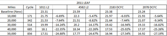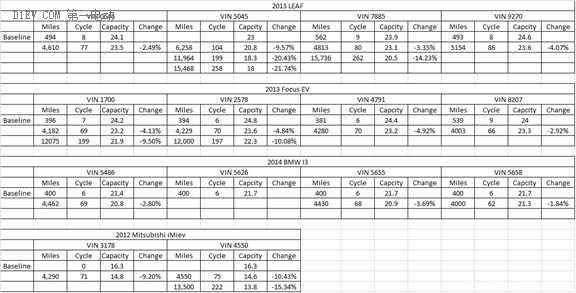 比較靠譜的美國INL實驗室對其他純電動汽車做了很多實際的記錄,這個記錄方法是通過跑里程,將電池進行容量測試進行的。它的設計方法,一般是選4輛車,然后進行對比和確認。如圖5所示,主要對比的是美國的3.3KW充電和直流充電對車產生的影響,總體來看,影響不是特別大。
