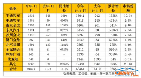 南京金龍1-11月累計產量6164輛,排名第三名,市場份額為9.0%,跟中通客車的差距僅500多輛。