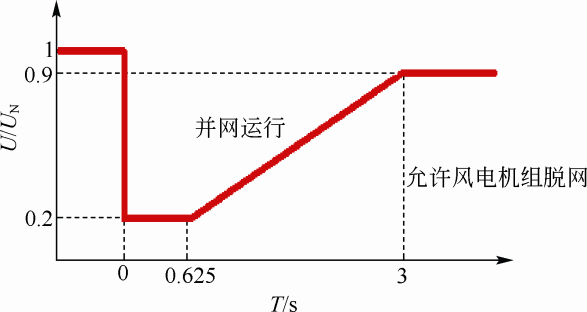 如果并網(wǎng)點不能實現(xiàn)有效的低電壓穿越,在短時間內(nèi)恢復(一般規(guī)定0.625 s,如圖2所示),會導致重大事故。2011年2月24日,甘肅電網(wǎng)酒泉風機公司16個風電場脫網(wǎng)598臺,損失837.34 MW,電網(wǎng)頻率下降到49.854 Hz,風電場出力損失54.4%;河北張家口也在2011年4月17日風機脫網(wǎng)644臺,電網(wǎng)頻率下降到49.815 Hz,風電場出力損失48.5%。因此,國家電網(wǎng)在《風電場接入電網(wǎng)技術(shù)規(guī)定(修訂版)》、《光伏電站接入電網(wǎng)技術(shù)規(guī)范》和《關(guān)于做好分布式電源并網(wǎng)服務工作的意見》中均明確規(guī)定,對目前風力發(fā)電中3種主力風力發(fā)電機均要求具有低電壓穿越能力,對光伏發(fā)電并網(wǎng)中的低電壓穿越問題也提到議事日程。由超級電容器和變換器組成的儲能系統(tǒng),通過吸收(或釋放)電能平衡直流母線兩側(cè)的功率,既可以使發(fā)電機與電網(wǎng)故障相隔離,又可以提高風電系統(tǒng)的低電壓穿越能力。