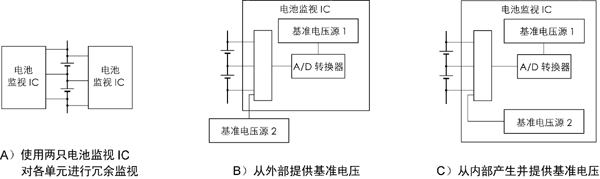 其中,A)電路為使用兩組IC對同一組電池組進行冗余監視;B)為從外部提供一個標準電壓源2用于確認IC的測定精度。C)為從內部產生該標準電壓源。