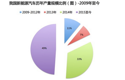 與此同時(shí),從2009年至今,我國(guó)新能源汽車(chē)尤其進(jìn)入2014年后,開(kāi)始集中爆發(fā),其中,2014年和2015年至今的產(chǎn)量規(guī)模,甚至占據(jù)了2009至今所有產(chǎn)量規(guī)模的80%以上。