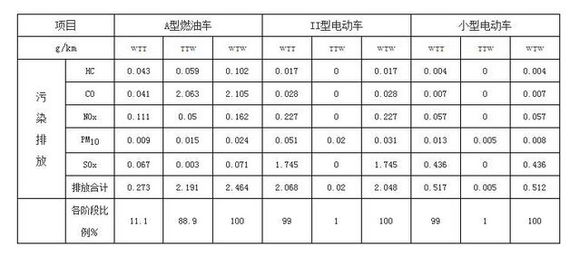 是否所有電動(dòng)汽車都比燃油車更環(huán)保?汽車的生命周期評(píng)估中引入了汽車尾氣中的非甲烷烴(NMHC)、氮氧化物(NOx)、懸浮顆粒物(PM)、硫氧化物(SOx)等排放量的計(jì)算。為了便于比較,增加小型電動(dòng)車的廢氣排放分析,取樣為整備質(zhì)量為400 kg的小型電動(dòng)汽車,經(jīng)濟(jì)性指標(biāo)目標(biāo)值為5kWh/100 km。根據(jù)電力行業(yè)火電廠平均供電標(biāo)準(zhǔn)煤耗及SOx排放等指標(biāo),基本結(jié)果分析如下: