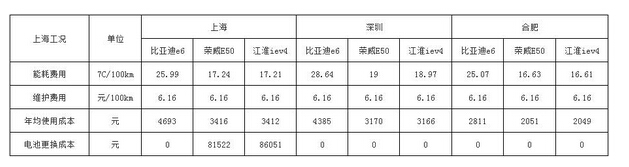 注:上海市充電電價(jià)為0.617元/kWh,深圳市充電電價(jià)為0.68元/kWh,合肥市充電電價(jià)為0.5953元/kWh。上海市消費(fèi)者日均行駛里程為40km,年均行駛14400km (假設(shè)每年行駛360天);深圳市消費(fèi)者日均行駛里程為35km,年均行駛12600km;合肥市消費(fèi)者日均行駛里程為25km,年均行駛9000km。在車輛維護(hù)費(fèi)用方面,主要包括車輛維護(hù)保養(yǎng)費(fèi)、車輛維修費(fèi)、保險(xiǎn)費(fèi)、養(yǎng)路費(fèi)等,純電動(dòng)汽車年檢保養(yǎng)費(fèi)用約為每l00km/6.16元,普通車輛為每l00km/14元;在電池更換成本方面,本文取電池循環(huán)充電次數(shù)為2000次。