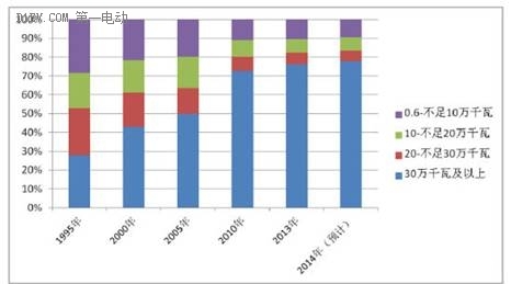 《中國電力企業聯合會:中國電力工業現狀與展望》指出:2014年,火電結構進一步優化,技術水平進一步提高。高參數、大容量、高效環保型機組比例進一步提高。 據中電聯初步統計,截至2014年底,全國30萬千瓦及以上火電機組比例達到77.7%,比2013年提高近1.4個百分點。