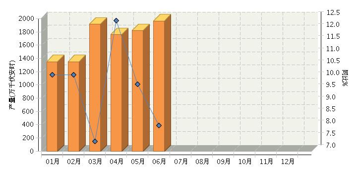 根據國家統計局公布數據,2014年1~6月,全國鉛酸蓄電池行業累計完成產量10,737.78萬千伏安時,同比增長8.10%。其中6月份完成產量1962.62萬千伏安時,同比增長8.07%。2014年全國鉛酸蓄電池行業月度產量及同比如下圖所示。