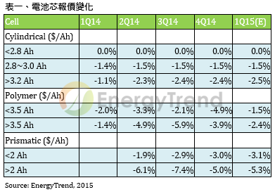 呂理舜進一步表示,由于 2014 年第四季市場產品亮點僅剩蘋果的 iPhone,因此高分子電池的供需變化是目前供應端的關注焦點。受到中國政策補助的影響,中國高分子電池積極擴產,高分子電池價格持續激烈競爭。另一方面,電池采用的平均容量也隨著機種尺寸加大而持續提升,手機與平板的電池容量差益縮小,共用性的情況逐漸增加,導致高分子電池芯單位容量價格穩定下降 4~5%。