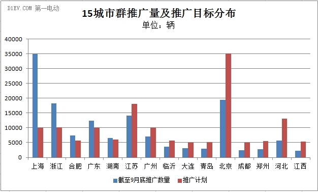截至2015年9月,39個(gè)新能源汽車推廣應(yīng)用城市(區(qū)域)累計(jì)推廣應(yīng)用新能源汽車總量達(dá)到180945輛,較上月增長13.4%。其中,較之8月,新增完成推廣目標(biāo)的城市(群)僅有廣東城市群,完成推廣量12377輛,超過推廣目標(biāo)5千輛之多,僅9月推廣量就達(dá)5327輛。