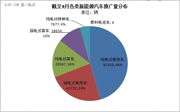 從推廣車輛類型看,純電動(dòng)乘用車82339輛,占總數(shù)45.50%;插電式混合動(dòng)力乘用車42722輛,占總數(shù)23.61%;純電動(dòng)客車29567輛,占總數(shù)16.34%;插電式混合動(dòng)力客車18634輛,占總數(shù)10.30%;純電動(dòng)特種車7677輛,占總數(shù)4.24%;燃料電池乘用車6輛。