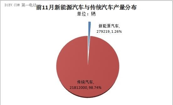 根據機動車整車出廠合格證統計,今年1-11月新能源汽車累計產量達27.92萬輛,占比傳統車累計產量的1.28%。銷量方面,根據中汽協數據統計,今年1-10月新能源汽車累計銷量171145輛,已占傳統車總銷量(1927萬輛)的0.88%。