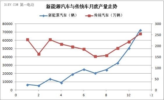 從月度產量走勢圖上可看出,今年前11月新能源汽車與傳統車產量走勢波動近似,尤其是從7月開始,連續4個月實現不同幅度增長。不同的是,雖然新能源汽車發展初期產量基數相對傳統車較少,但其增勢表現十分強勁。