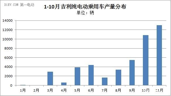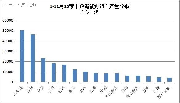 排在第二位的吉利產量累計達4.6萬輛,純電動乘用車領域中,吉利一家獨大,從9月5千多輛躍升至10、11月連續兩月萬輛水平,兩月連續占據純電動乘用車總產量的近50%。吉利旗下主力車型主要包括知豆系列、康迪車型。主打“微公交”領域的康迪電動車,經過2年多的發展,已在杭州投放超過16000多輛,延伸至上海、南京、武漢、成都、廣州、長沙、昆明等10余座城市開展試運行。