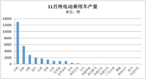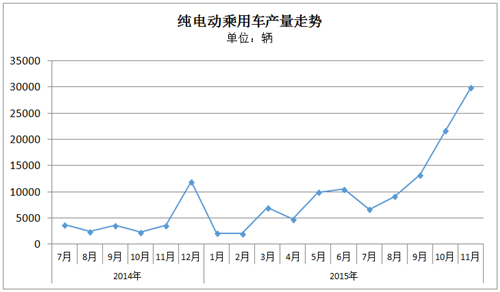 繼9月產(chǎn)量超過去年最高月度產(chǎn)量最高值(1.2萬輛),在10、11月連續(xù)兩個月,純電動乘用車不斷刷新月度產(chǎn)量紀(jì)錄。根據(jù)機(jī)動車出廠合格證統(tǒng)計,11月純電動乘用車產(chǎn)量達(dá)3萬輛,同比增長7倍。