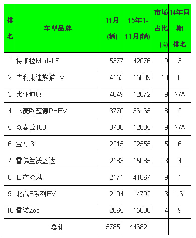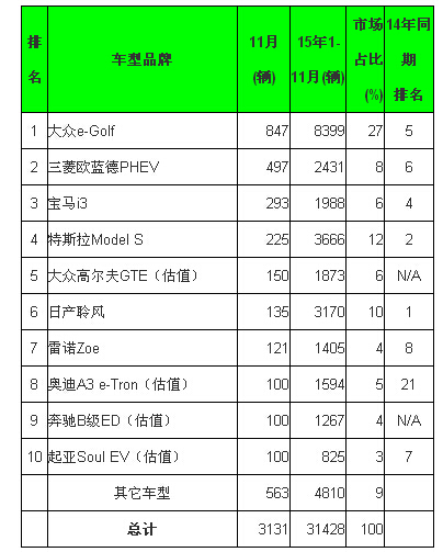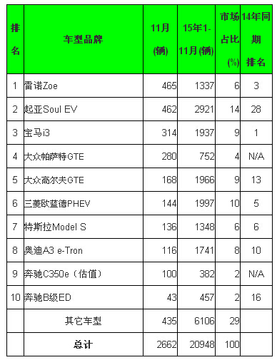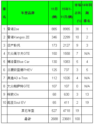 從今年前11個月的累計銷售情況看,主要的變化是雷諾Kangoo ZE返回到第二位,與日產聆風調換位置。三菱歐藍德PHEV攀升至第7,標致iOn上升一個位置至第9,雷諾TWIZY和起亞Soul EV現在分列第11和第13,雪鐵龍C-Zero上升一位到第16。