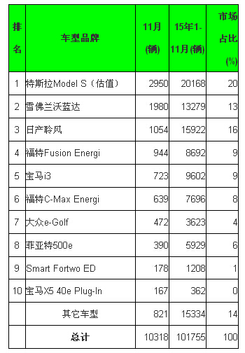 特斯拉Model S是當月的銷量冠軍,共售出5377輛,同比增長143%,不僅成為賣的最好的車型(今年第三次),而且2015年前11個月的累計銷量也首次超過日產聆風(Leaf)。通常每季度的最后一個月都是Model S的銷售高峰期。