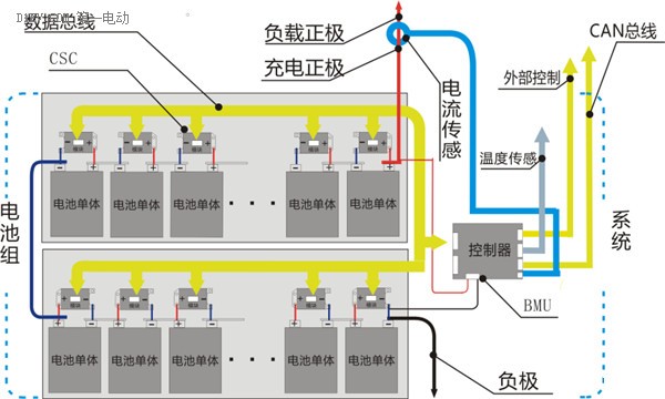 為了解決連線復雜的難題,出現了分布式架構的BMS。這種BMS是將信息采集傳遞的功能與其他功能獨立分離,整個系統分成了CSC(單體管理單元)、BMU(電池管理控制器),CSC安裝在單串電池上,負責本串電池信息采集和傳遞,每串電池的信息通過總線傳入BMU。這種架構通過總線解決了線束復雜的難題,而且安裝相對簡單,效率高,柔性好,適合不同電池組規模大小。分布式的BMS可以不用電池管理專用IC,是拋開專用IC進行創新設計的一個相對成功的思路。不足的是,分布式架構也沒有解決一一對應的關系和主動均衡的難題,CSC同樣需要設置地址(雖然可以在安裝后設置,比集中式架構在安裝前就需要確定要容易實現,出錯概率小),主動均衡仍然需要額外的線束和開關矩陣。而且因為每個CSC上都需要MCU和帶有隔離的通訊總線,價格要高于集中式架構BMS,尤其在低串數上優勢不大。