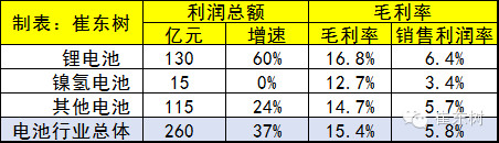 15年的電池行業因新能源車火爆而日子很好利潤增長豐厚,其中鋰電池企業的利潤增長達到130億元,增長60%。銷售利潤率也達到6.4%,遠高于鎳氫電池企業和鉛酸電池企業的盈利。鎳氫電池行業處于艱難的低增長的日子。