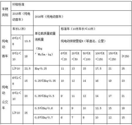 注:純電動客車(純電動公交車)補貼標準以2016年為基準,2017-2018年補助標準在2016年基礎上下降20%,2019-2020年補助標準在2016年基礎上下降40%,補貼長度以10—12米純電動客車為標準車,其他長度純電動客車補貼標準按照上表單位載質量能量消耗量和純動車續駛里程劃分,插電式混合動力客車(含增程式)補貼標準按照上表純動車續駛里程劃分,其中,6米及以下客車按照標準車0.2倍給予補助;6米<車長≤8米客車按照標準車0.5倍給予補助;8米<車長≤10米客車按照標準車0.8倍給予補助;12米以上、雙層客車按照標準車1.2倍給予補助。