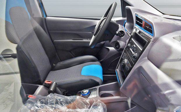 北汽新能源C10車內采用了黑色與藍色搭配的雙色組合,其中控臺造型簡潔,并突出了主打實用性的設計思路。細化來看,該車中控臺中央設置有上下兩處儲物格,換擋機構依然為旋鈕式設計,手剎拉桿也擁有與眾不同的造型。