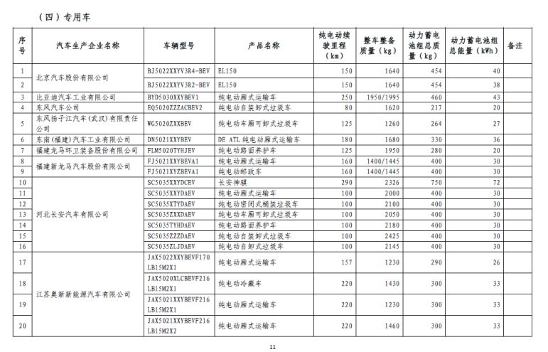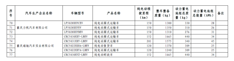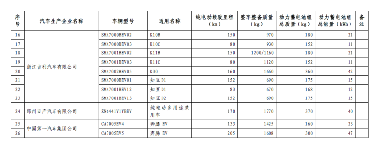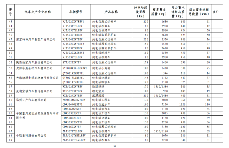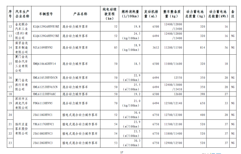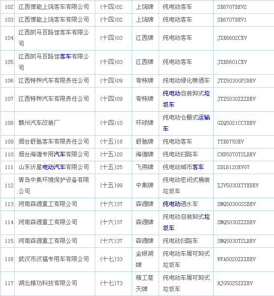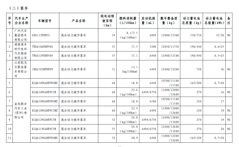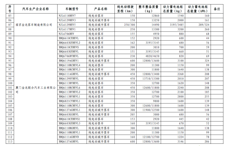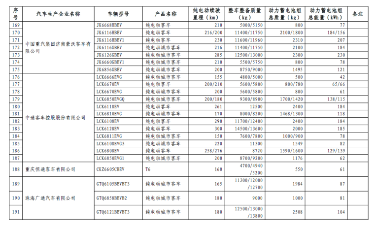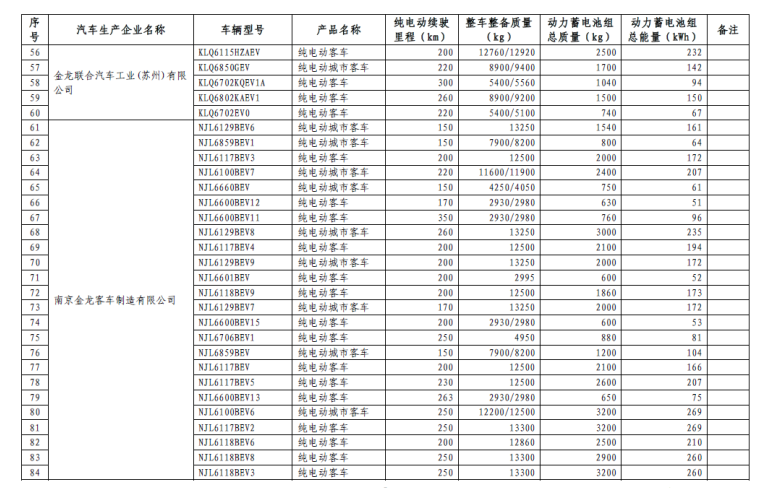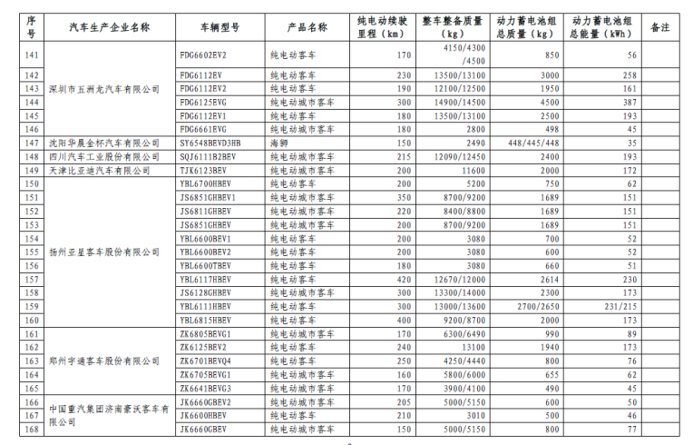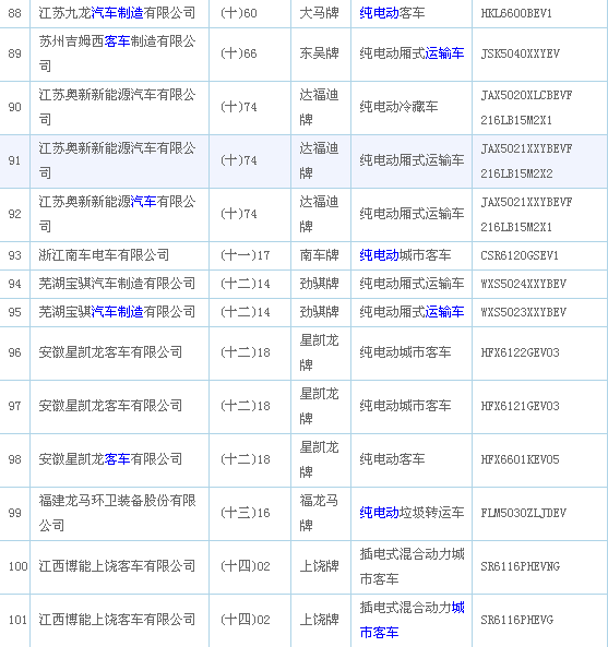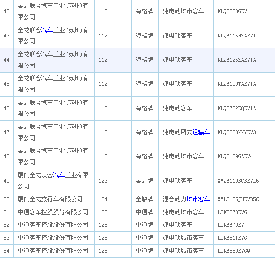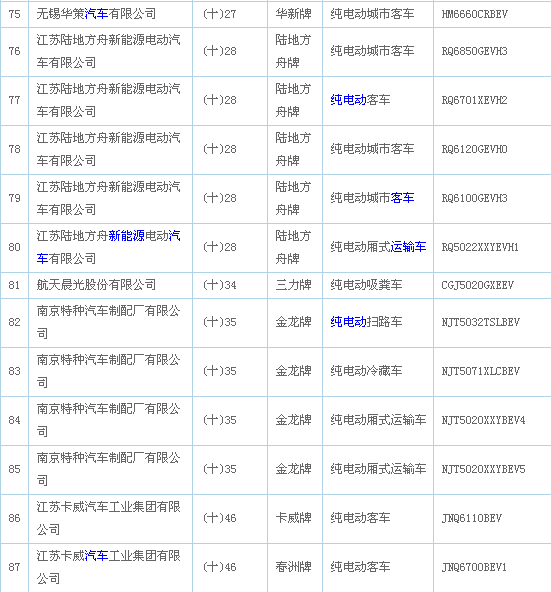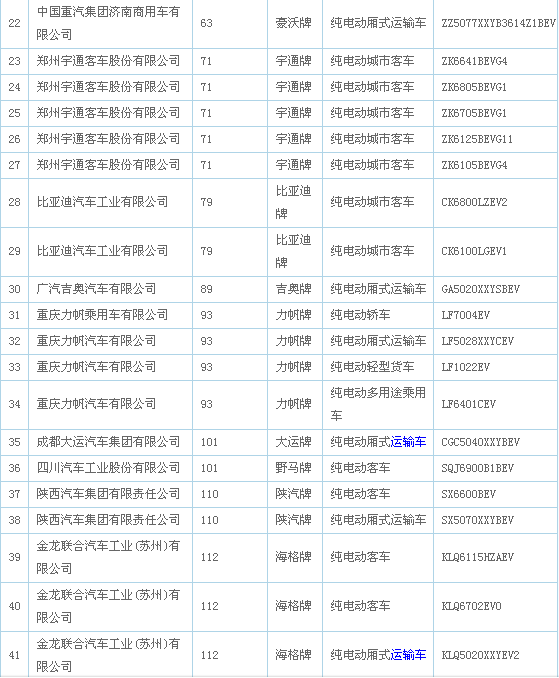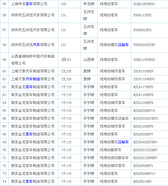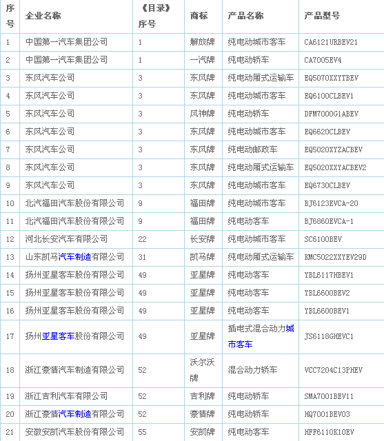 目錄中入圍的廠家分別是:北汽福田汽車股份有限公司、東風汽車公司、揚州亞星客車股份有限公司、浙江豪情汽車制造有限公司、鄭州宇通客車股份有限公司、比亞迪汽車工業有限公司、重慶力帆乘用車有限公司、成都大運汽車集團有限公司、金龍聯合汽車工業(蘇州)有限公司、中通客車控股股份有限公司、上海申龍客車有限公司、深圳市五洲龍汽車有限公司、南京金龍客車制造有限公司、江蘇陸地方舟新能源電動汽車有限公司、江蘇九龍汽車制造有限公司...