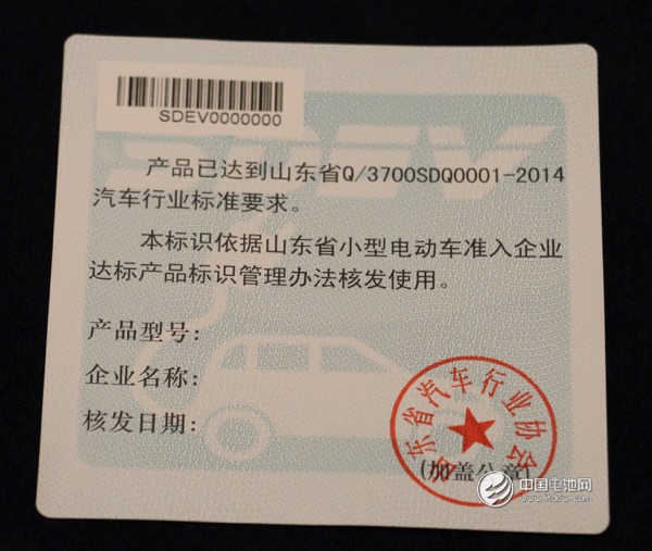 山東省小型電動車準入企業達標產品標識