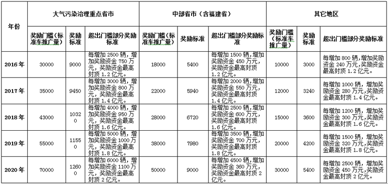 按照獎(jiǎng)補(bǔ)標(biāo)準(zhǔn),各地新能源汽車推廣數(shù)量越大,獲得的獎(jiǎng)補(bǔ)資金越多,獎(jiǎng)補(bǔ)門檻也將不斷提高。如2016年大氣污染治理重點(diǎn)區(qū)域和重點(diǎn)省市的獎(jiǎng)補(bǔ)門檻(標(biāo)準(zhǔn)車推廣量)為30000輛,獎(jiǎng)補(bǔ)標(biāo)準(zhǔn)為9000萬元,每增加2500輛,增加獎(jiǎng)補(bǔ)資金750萬元,獎(jiǎng)補(bǔ)資金最高封頂1.2億元。到2020年,獎(jiǎng)補(bǔ)門檻(標(biāo)準(zhǔn)車推廣量)將增加到70000輛,獎(jiǎng)補(bǔ)標(biāo)準(zhǔn)為12600萬元,每增加6000輛,增加獎(jiǎng)補(bǔ)資金1100萬元,獎(jiǎng)補(bǔ)資金最高封頂2億元。