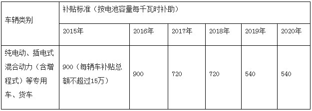 2016年純電動(dòng)、插電式混合動(dòng)力(含增程式)等專用車、貨車按電池容量每千瓦時(shí)補(bǔ)助900元。2016-2020年燃料電池乘用車補(bǔ)貼10萬元,輕型客車、貨車補(bǔ)貼15萬元,中型客車、中型重型貨車補(bǔ)貼25萬元。