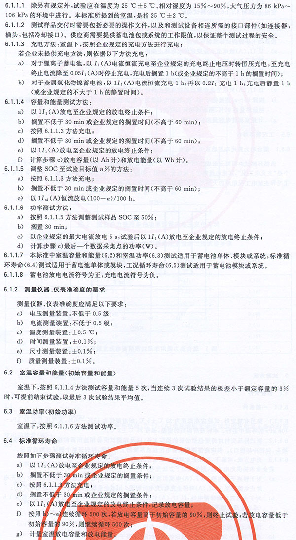 5.1.2蓄電池模塊和系統按照6.2試驗時,其放電容量不應低于額定容量,并且不超過額定容量的110%,同時所有測試樣品初始容量極差不大于初始容量平均值的7%。