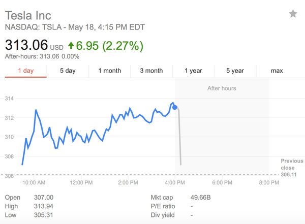 就在本周三,特斯拉提前公布靚麗的一季度財報之后,該股突破300美元大關,市值一度高達527億美元,一舉趕超位居業內第二的美國汽車制造商福特和通用汽車。今年以來,該股累計漲了40%,投資者對特斯拉即將推出的首款面向大眾市場的汽車Model 3充滿樂觀預期。同期標普500指數僅上漲5.4%。 今日,特斯拉股價上漲2.27%,收報313.06美元,市值496.6億美元。