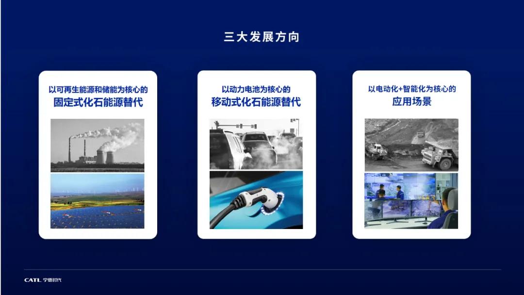 我們將公司業務聚焦于三大市場。第一,我們希望以可再生能源和儲能為中心,替代固定式化石能源,這樣對人類的新能源事業可以作出真正的貢獻。第二是以動力電池為核心的移動式化石能源替代,希望把石油減少,既減少二氧化碳排放,又可以為國家的能源安全作出貢獻。第三是以電動化+智能化為核心的應用場景,例如我剛提到的無人礦山、電動重卡、電動船舶等案例。