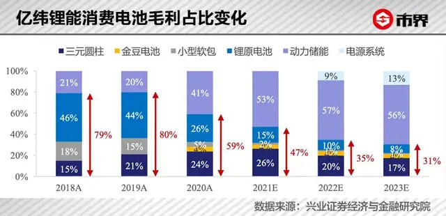 據(jù)興業(yè)證券的研究報(bào)告顯示,從2018年到2020年,消費(fèi)電池為億緯鋰能貢獻(xiàn)的毛利,占比從79%下滑至59%。億緯鋰能只有在動(dòng)力電池領(lǐng)域殺出一片戰(zhàn)績(jī),才能繼續(xù)把故事講下去。