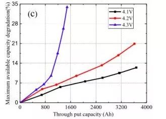 從數(shù)據(jù)可以看到,隨著充電的倍率的加大,鋰離子電池的衰降速率也在快速增加,并且從曲線的斜率來看,電池的衰降速度存在三個不同的階段,前期衰降速度較快的階段(階段1),中間衰降速度較慢的穩(wěn)定階段(階段2),和后期的衰降速率加速階段(階段3)。針對三個階段電池的衰降機理的研究認(rèn)為,階段1可能是因為電池SEI膜生長需要消耗一部分Li+,因此衰降速度較快。在階段2隨著SEI膜結(jié)構(gòu)的穩(wěn)定,內(nèi)部較為穩(wěn)定,因此衰降速度較慢,在階段3隨著電池老化,開始發(fā)生活性物質(zhì)損失,電極活性界面減少,導(dǎo)致電池對于電流十分敏感。圖C是針對不同的截止電壓對電池衰降速度影響的實驗,從實驗結(jié)果可以看到,當(dāng)把充電截止電壓提高到4.3V時會導(dǎo)致電池的循環(huán)性能急劇惡化,降低充電截止電壓可以有效的改善電池的循環(huán)性能。