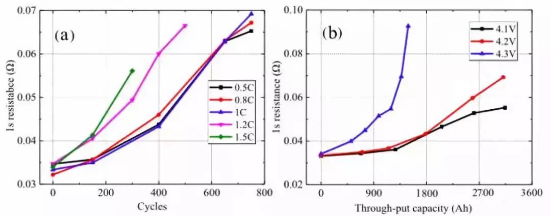 對電池的動態(tài)內(nèi)阻分析如圖所示,從圖a測試結(jié)果來看,當(dāng)充電電流小于1C時,電池動態(tài)內(nèi)阻隨著電池循環(huán)的變化趨勢幾乎時一樣的,但是當(dāng)充電電流超過1C時,電池動態(tài)內(nèi)阻增加速度會隨著充電速率的增加而快速增加。從圖b的測試結(jié)果來看,當(dāng)充電截止電壓為4.3V時,電池動態(tài)內(nèi)阻增加非常迅速表明高截止電壓會惡化電池的動力學(xué)條件,截止電壓為4.1V和4.2V時電池動態(tài)內(nèi)阻增加較為緩慢。