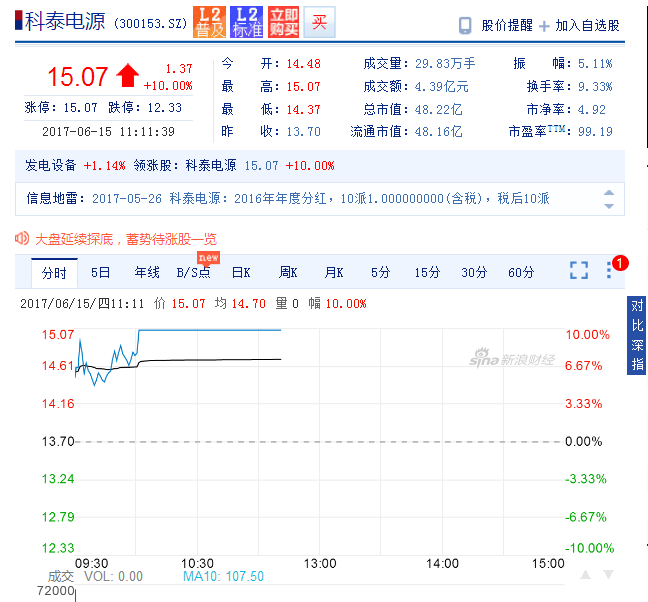 今日電池雜志-電池聯盟訊 6月15日,繼6月13日漲停之后,科泰電源再度漲停,且是一字漲停,強度更甚13日表現。6月2日低位反彈以來,該股已累計上漲24.43%。