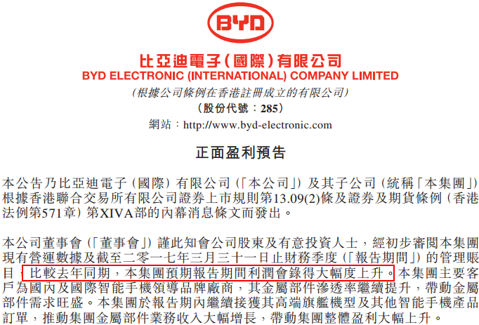 在金屬部件市場強勁需求下,2016年比亞迪電子的金屬部件業務收入同比大增超過50%,進而拉動總體的營收和利潤。