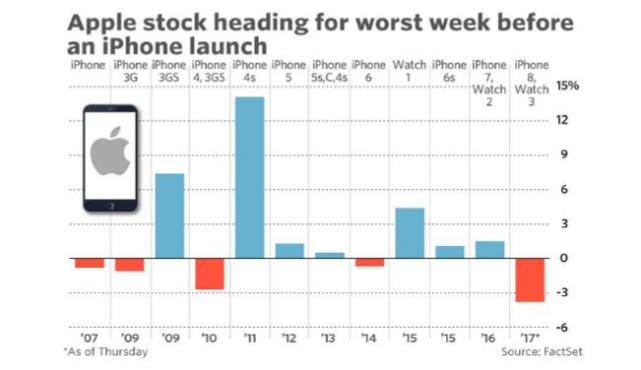 蘋果股價(jià)上周下跌5% 有人說是因?yàn)閕Phone 8遇冷2017-09-25 15:31