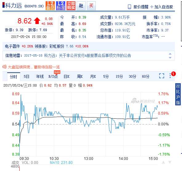 2016年12月28日,科力遠非公開發行A股股票申請獲得審核通過。然而,自2016年以來,科力遠的股價呈現出震蕩下跌的趨勢,5月23日科力遠報收8.54元/股,與定增價9.54元/股已明顯倒掛。