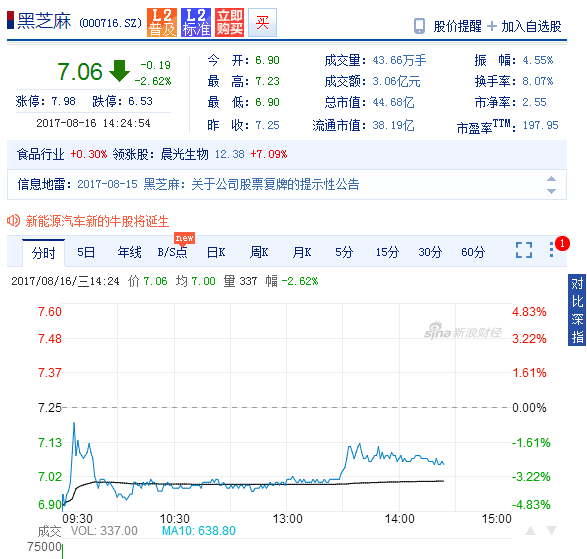 停牌8個多月的黑芝麻昨日復牌遭遇一字跌停。今日盤中再度大跌近4%。