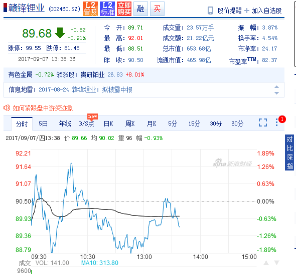 昨日盤中,贛鋒鋰業展開巨震,午后漲幅一度達8%,盤中股價創歷史新高達到95.50元,但隨后一路回落,截至收盤,贛鋒鋰業股價報收90.50元,漲幅2.67%,成交金額49.52億元,換手率達10.52。