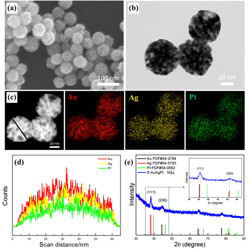 圖1. (a)-(b) 分別為AuAgPt三元合金納米球的場發(fā)射掃描電子顯微鏡和透射電鏡圖;(c) AuAgPt三元合金納米球的高角環(huán)形暗場-掃描投射圖片和元素分布圖;(d)線掃元素分布圖;(e)AuAgPt三元合金納米球的X射線衍射圖譜。