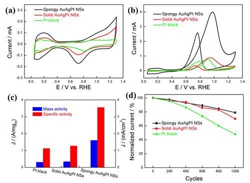 圖3. AuAgPt三元合金納米球、實心AuAgPt合金納米球和鉑黑甲醇電催化性能測試。(a) 在氮?dú)怙柡偷?.1 M HClO4 溶液中測試得到的循環(huán)伏安圖;(b) 在0.1 M HClO4 + 0.2 M甲醇溶液中測試得到的甲醇氧化曲線;(c) 不同催化劑的甲醇氧化活性對比柱狀圖;(d) 穩(wěn)定性測試對比圖。