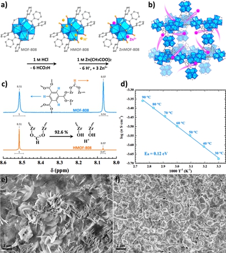 圖:a)MOF-808的離子化后修飾過程;b)ZnMOF-808單Zn2 離子導(dǎo)體的結(jié)構(gòu)示意圖;c)MOF-808的離子化前后的NMR圖譜對比;d)ZnMOF-808單Zn2 離子導(dǎo)體電導(dǎo)率的阿倫尼烏斯曲線;鋅片負(fù)極在e)1 M ZnSO4電解液和f)ZnMOF-808單Zn2 離子導(dǎo)體中的Zn沉積形貌