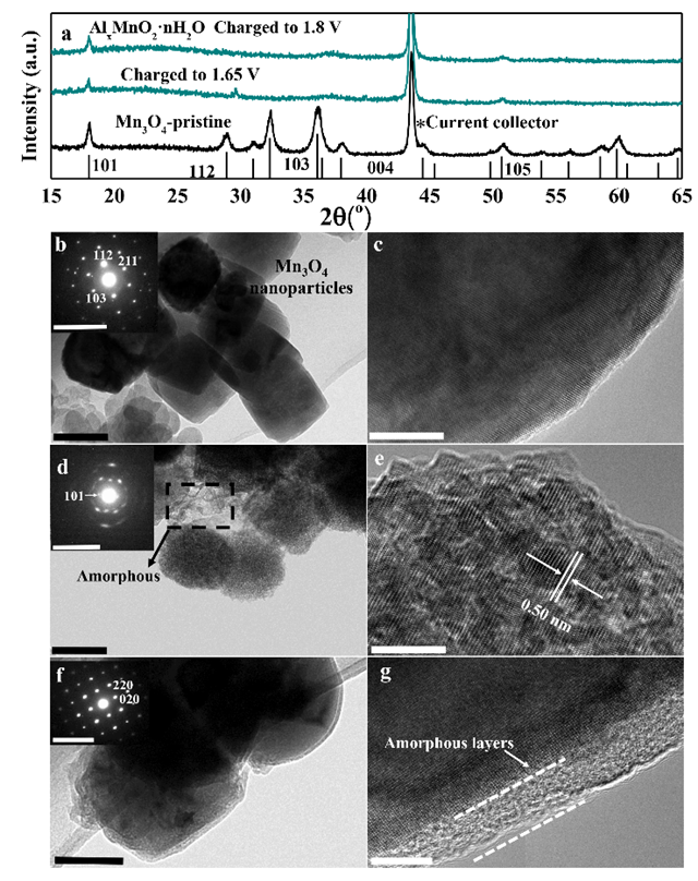 3+從尖晶石結構中溶出,在電流作用下被氧化形成的無定形相重新沉積在原本的納米顆粒表面,所以在球差電鏡中可以清晰地看到尖晶石、層狀和無定形相混合存在的現象。表面的含水無定型層結構有利于鋁離子的嵌入脫出,使得正極材料具有快速脫嵌鋁離子的能力。