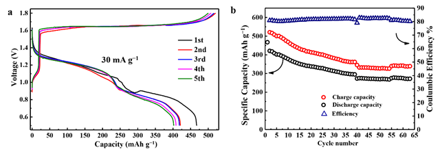 -1加之較高的放電平臺電壓(平均值達到1.1V)使得該電極材料的能量密度高達481Wh kg