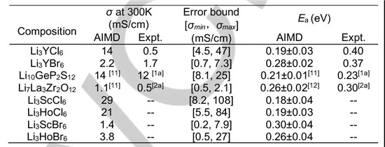 研究者還發現不管陽離子如何,這種基于Cl和Br陰離子緊密堆積的hcp和fcc框架通?梢蕴峁┝己玫碾x子電導率。采用第一性原理計算研究者預測了幾個同形結構取代LYC和LYB中的Y3+陽離子,如Li3MX6(M = Dy,Gd,Ho,La,Nd,Sc,Sm,Tb,Tm; X = Cl,Br)。通過特定的能量測量(ΔEhull),發現這些物質均具有良好的相穩定性。與基于相同fcc和hcp陰離子骨架的其他陽離子相比,Li3ScCl6和Li3HoCl6的離子電導率可達10-4至10-3 S/cm,與超離子導體相當。