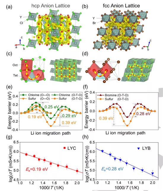 研究者還比較了不同的陰離子影響,模擬了Cl,Br和S在hcp和fcc亞晶格中單個Li+遷移的能量與晶格體積的關系。如圖1e-f所示,在相同晶格體積的LYC和LYB中,當Cl和Br陰離子晶型為hcp時,Li+沿c-通道Oct-Oct通路的勢壘為0.25 eV,Oct-Tet-Oct通路為0.29 eV;當晶型為fcc時,OctTet-Oct通路的勢壘為0.28 eV,與AIMD模擬獲得的活化能結果一致?梢园l現氯化物和溴化物的fcc和hcp陰離子晶格可以表現出低至0.2-0.3 eV的遷移勢壘,因而可以實現10-3 S/cm的高離子電導率。正因這些特性,氯化物和溴化物不需要激活鋰離子的協同遷移以實現快速離子擴散,AIMD模擬也顯示無多個Li離子的協同遷移。由于協同遷移需要在主體晶體結構中進行Li填充,因此氯化物和溴化物不會受到類似于氧化物和硫化物所遇到的結構性要求,可以為快速離子遷移提供更廣泛的結構。