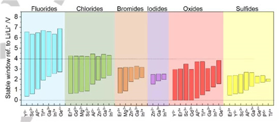 研究者發現這些鹵化物不僅具有卓越的鋰離子傳導性,還具有寬的電化學窗口,差的電子傳導性以及良好的電極界面兼容性。他們經過理論計算發現,LYC和LYB分別具有6.02 eV和5.05 eV的寬帶隙,是不良的電子導體,如圖2所示。LYB和LYC均顯示寬的電化學窗口,陽極極限分別為3.5 V和4.2 V,陰極極限為0.6 V,明顯寬于許多硫化物和氧化物,如LGPS(1.72-2.29 V),L3PS4(1.71-2.31 V),LISICON(1.44-3.39 V)和Li0.33La0.56TiO3(1.75-3.71 V)。LYC在大于4 V時高的氧化穩定性有助于將其應用于鋰離子電池中;LYB在小于4 V時的氧化穩定性稍差,不足以滿足正極穩定性要求,高氧化穩定性是氯化物和溴化物陰離子的固有特性。如圖3中的Li-M-X三元化合物(M 為陽離子,X為F,Cl,Br,I,O,S),經過計算證實了電化學窗口和陰離子特性相關。雖然氟化物具有最佳的氧化穩定性,但氯化物在還原和氧化之間可以取得一個穩定性的平衡。正極側,氯化物比氧化物和硫化物具有更高的穩定性,完全滿足當前鋰離子電池正極的4 V電位。