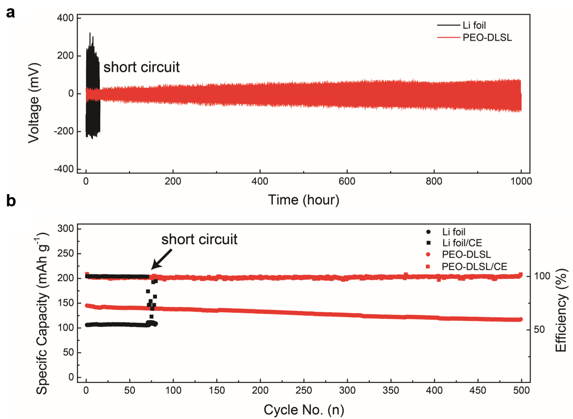 以PEO-SPE作為固態(tài)電解質(zhì),PEO-DLSL對稱電池在鋰脫出/沉積測試中可穩(wěn)定性循環(huán)超過1000小時不短路,同時極化電壓可以保持在100毫伏以下。而傳統(tǒng)的鋰箔負極表現(xiàn)出很高的極化電壓(200毫伏以上)并且在循環(huán)50圈后就發(fā)生了短路(圖2a)。研究人員進一步考察了PEO-DLSL在全固態(tài)鋰金屬電池(PEO-SPE為固態(tài)電解質(zhì),磷酸鐵鋰為正極)中的性能,如圖2b所示,基于PEO-DLSL的固態(tài)鋰金屬電池表現(xiàn)出非常好的循環(huán)穩(wěn)定性(0.5C倍率下可循環(huán)500圈,容量衰減速率為0.04%/每圈),而采用平板鋰箔的固態(tài)鋰金屬電池在循環(huán)75圈后即發(fā)生了短路(圖2a)。